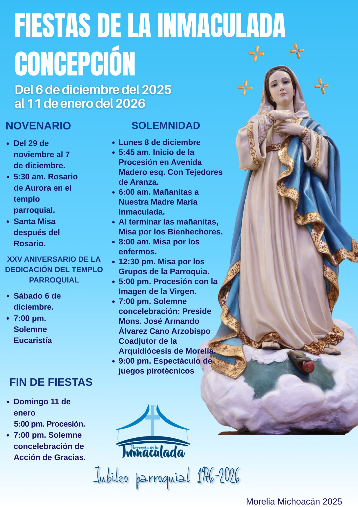 La fiesta de la Inmaculada se celebra del 8 de diciembre al 4 de febrero, aunque los preparativos inician desde agosto, ya que cuidan cada detalle para que el resultado sea excelente. La organización y participación de la comunidad resaltan en esta celebración.